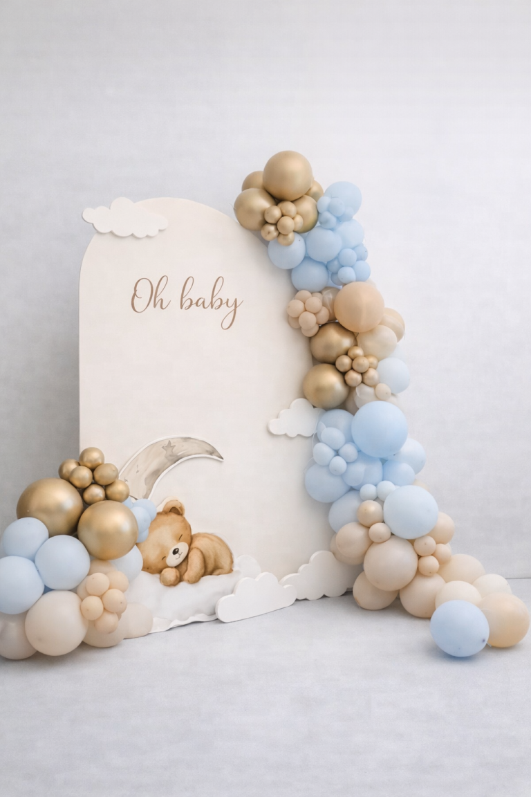 Retrouvez cette gamme comprenant : deux panneaux, des ballons gonflés, des nuages, l'ours et la lune. Il vous suffira simplement d’assembler les éléments entre eux. Une démonstration sera effectuée lors de la récupération du matériel de location. La main-d’œuvre de montage n’est pas comprise, mais peut être proposée sur demande si besoin.